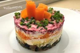 Веганский слоеный салат “селедка под шубой” готовится конечно же без селедки и любых иных морских обитателей. Вместо рыбы в рецепте используется комбинация баклажана и листа нори. Именно это сочетание — овоща и водорослей, придаёт настоящий рыбный вкус (не аромат!). Благодаря чему, постную “сельдь” под шубой сложно отличить от классического варианта салата (с сельдью). Салат получается […]